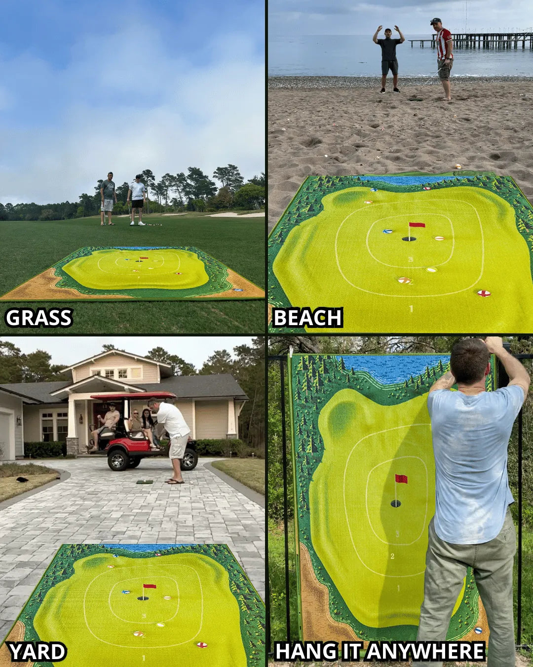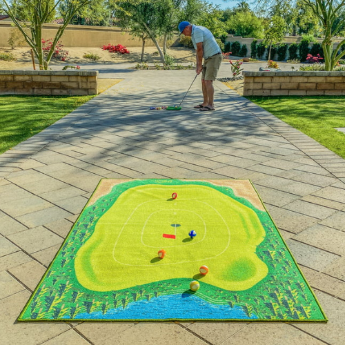- Use the 16 provided golf balls (4 colors) to chip onto the mat, aiming for targets with assigned point values.